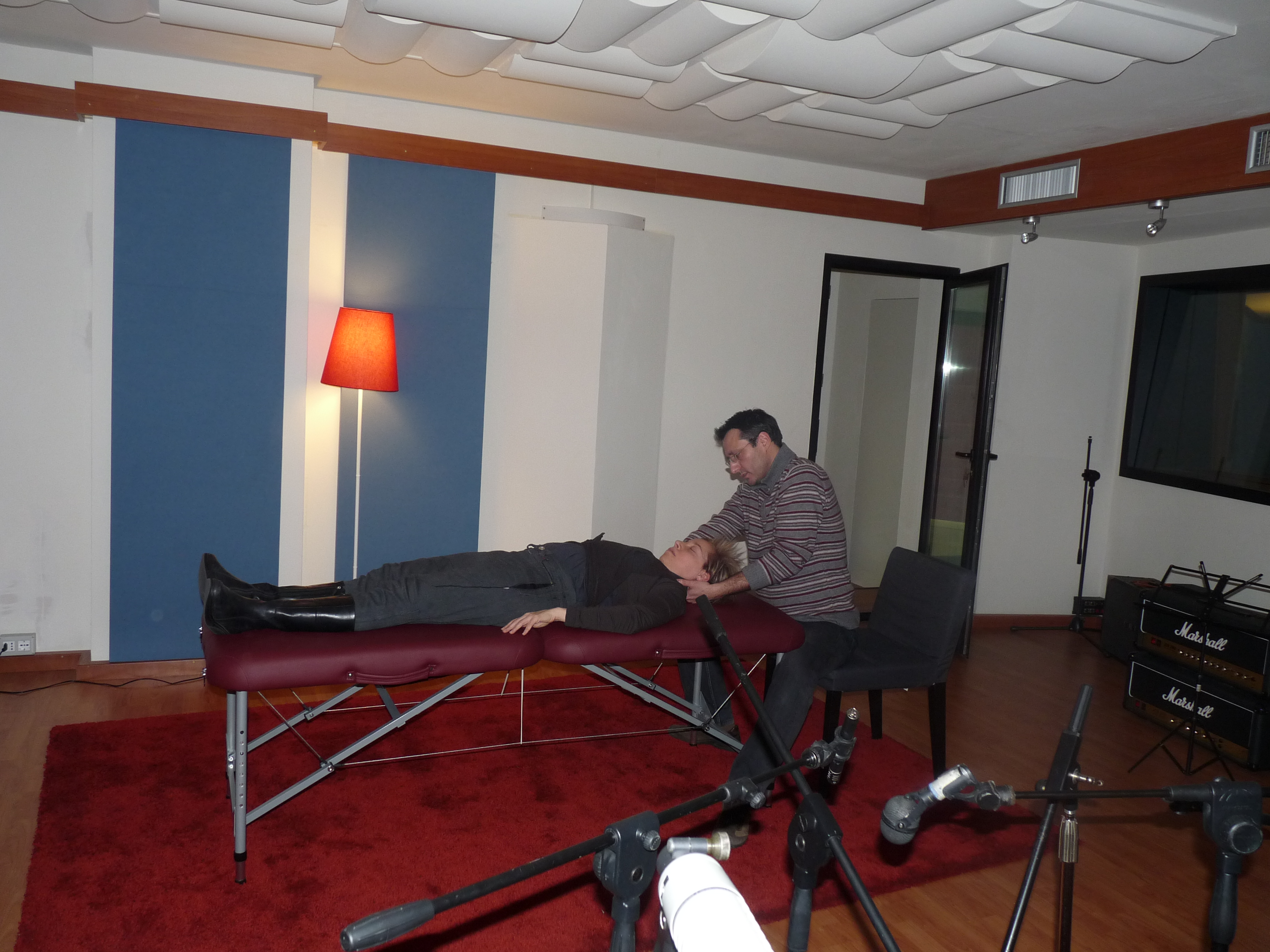 Le foto sono un esempio di come si possa, in casi fortunati, interagire con le professionalità specifiche (artista, fonico, insegnante) per meglio comprendere le modificazioni corporee ed i relativi cambiamenti nei suoni emessi non tanto per un’elaborazione di un protocollo rigido di trattamento ma per un prezioso scambio esperienziale nei diversi ambiti e competenze.