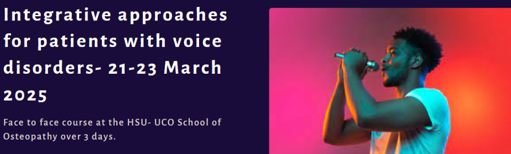 With a mix of practical workshops and underpinning research and theory this course will identify the main challenges of a patient presenting with voice dysfunction with special focus but not exclusively on the artistic vocal field.